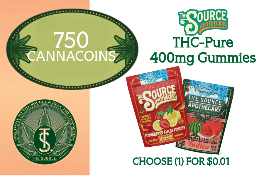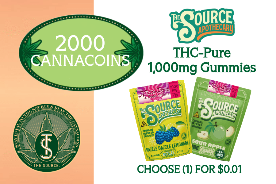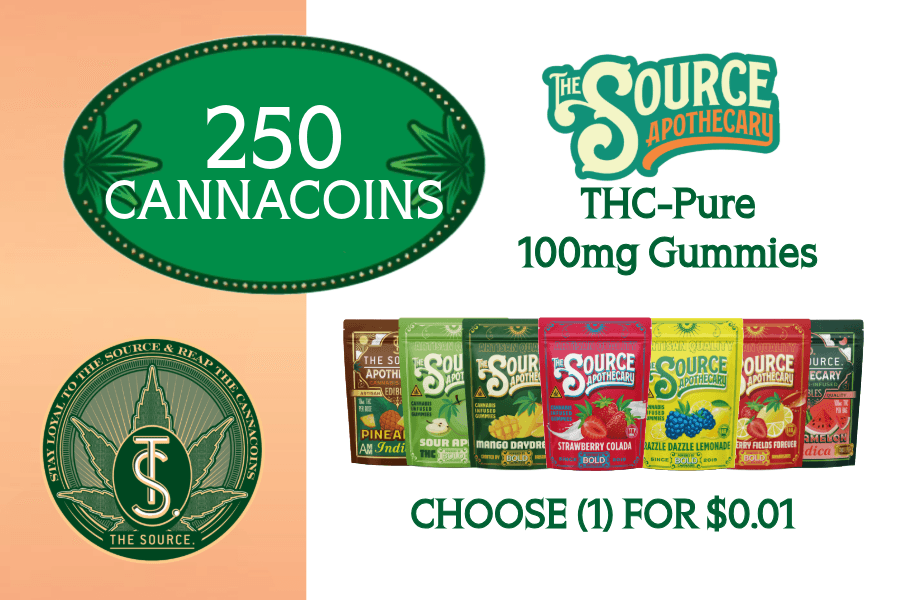 Accumulate 250 CannaCoins and redeem to get one The Source Apothecary 100mg Pure-THC Signature Formula Gummies for $0.01. (Note that TSA Cannabinoid Rich Gummies are excluded.)