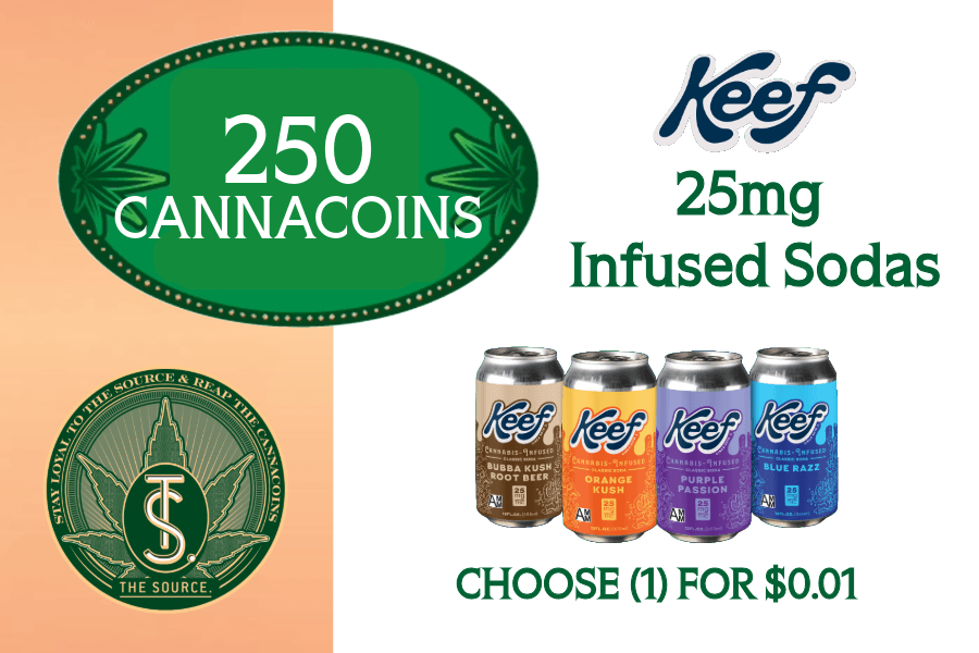 Accumulate 250 CannaCoins and redeem to get one Keef 25mg Infused Soda for $0.01. (Note that Keef 100mg Infused Sodas are excluded.)
