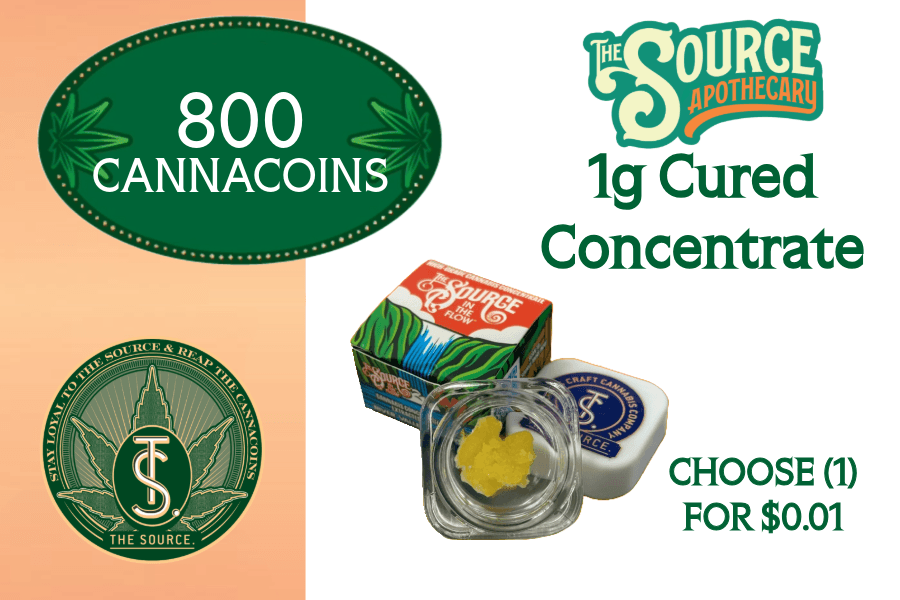 Accumulate 800 CannaCoins and redeem to get one The Source Apothecary 1g Cured Concentrate for $0.01.