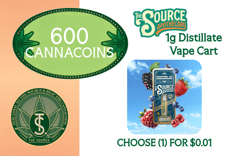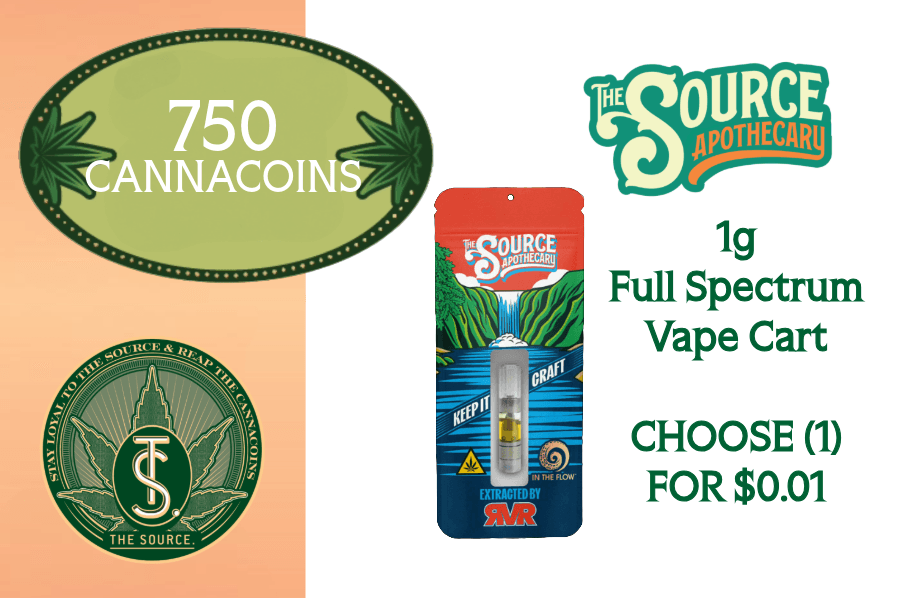 Accumulate 750 CannaCoins and redeem to get one The Source Apothecary 1g Full Spectrum Vape Cart for $0.01.