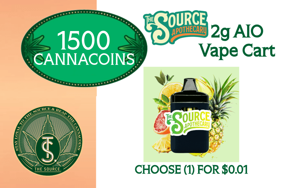 Accumulate 1500 CannaCoins and redeem to get one The Source Apothecary 2g All-in-One Vape for $0.01.