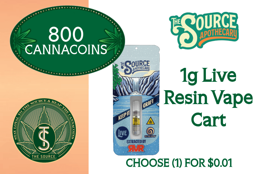 Accumulate 800 CannaCoins and redeem to get one The Source Apothecary 1g Live Resin Vape Cart for $0.01.